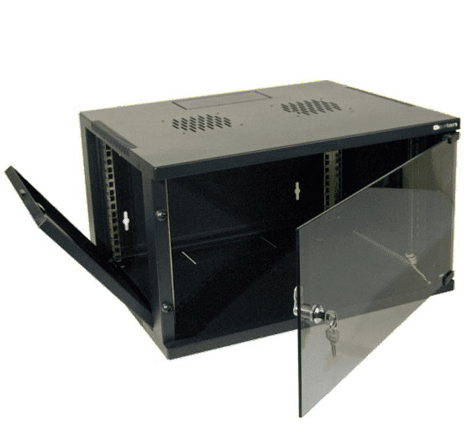 Le coffret 12U 450×450 mm noir dispose d’une porte avant en verre trempé avec serrure et de 2 panneaux latéraux amovibles.