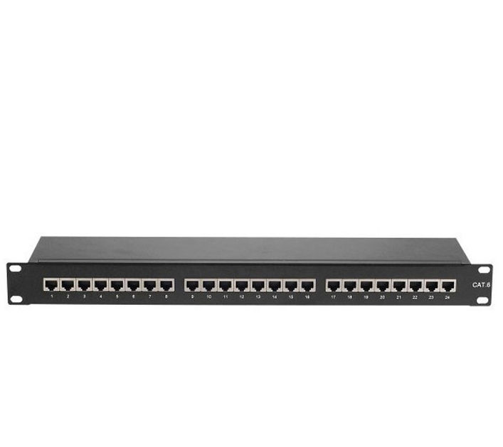 Cadre métallique robuste, couvercle solide en métal, cavalier de fixation et serre-câbles pour une installation de câblage fiable et un blindage contre les interférences. 24 ports RJ45 STP Cat.6, compatible Gigabit 10/100/1000, en 3 groupes de 8 ports Pour un câblage ultérieur à partir du haut, il est possible d’extraire le panneau de brassage vers l’avant du Rack 19 Avec couvercle pour un blindage à 360°, simple à retirer grâce à ses vis moletées”.